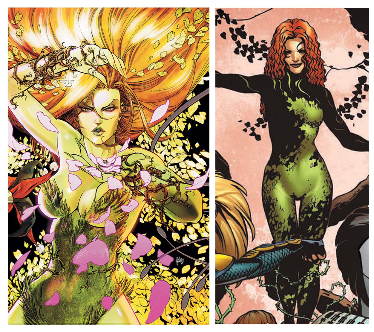 ¿Cómo fue que se decidió que un impráctico y sólido traje de baño verde (a veces con guantes y botitas) fuera lo convenido, en realidad no lo sabré?. Esa larga (y extraña) historia en cuanto a cómo hacerla más cool llevó a Saiz a darle un sentido totalmente distinto a su vestuario. Nos entregó un traje de cuerpo completo con increíble funcionalidad, no sólo desde el punto de vista práctico, sino también con una capacidad de adaptarse a su entorno (¡¿Qué es Poison Ivy, si no adaptable?!), desde cambiar de color, hasta los patrones de textura y los increíbles rasgos de su cara, realmente reconociendo lo que el personaje era y literalmente volviendo su traje una parte de ella. Checa estas variantes que Saiz nos ha mostrado en tan sólo unos pocos números: