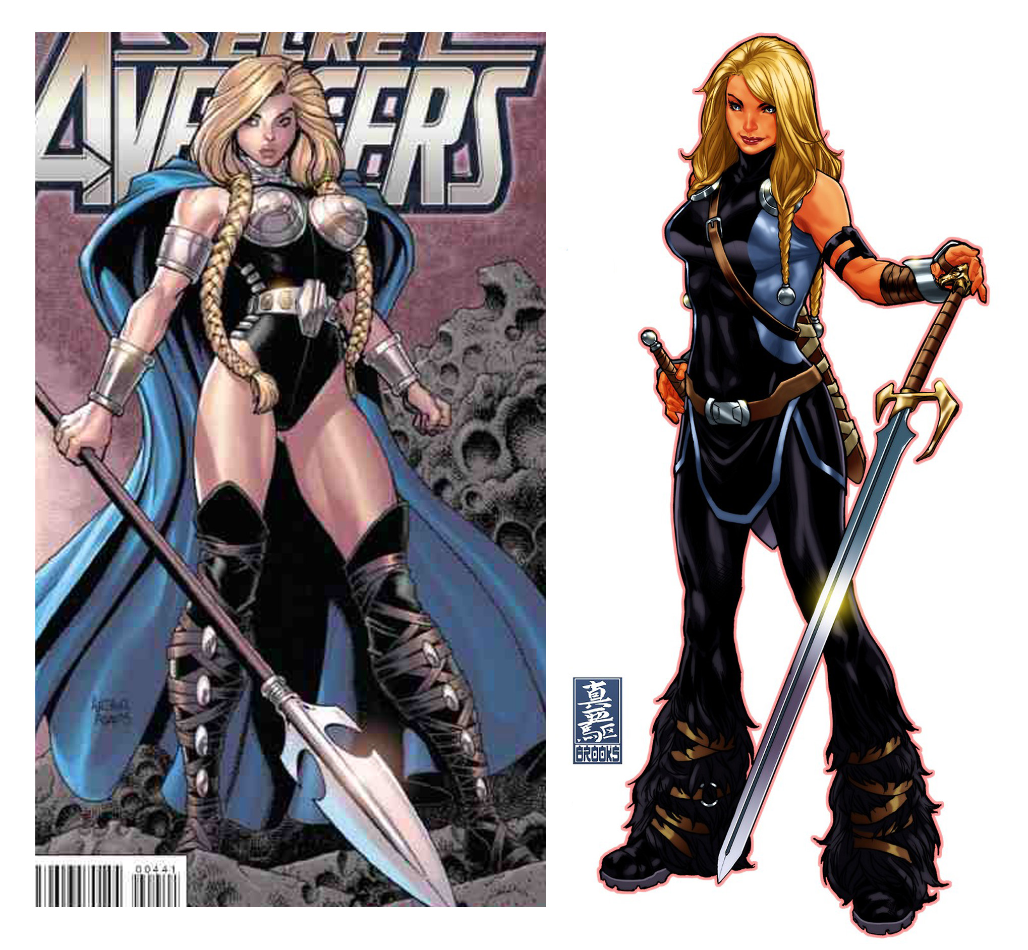 Una novísima adición en cuanto a rediseños de disfraces es este nuevo diseño de Valkyrie para Fearless Defenders, por Mark Brooks, el cual era necesario desde hace tiempo y no puedo creer que al fin lo tengamos. Adiós al ridículo traje de baño de corte alto y las botas ajustadas. Y más importante que todo, adiós a los ridículos pechos de torpedo metálicos que jamás fueron una buena idea. ¡Aún no he visto hasta el momento a un artista, sin importar qué tan talentoso sea, pueda hacer que ese ridículo diseño de sostén metálico se vea bien! (para muestra, el brillante Art Adams ilustrando a Valkyrie en la imagen de arriba a la izquierda – ¡ridícula!).