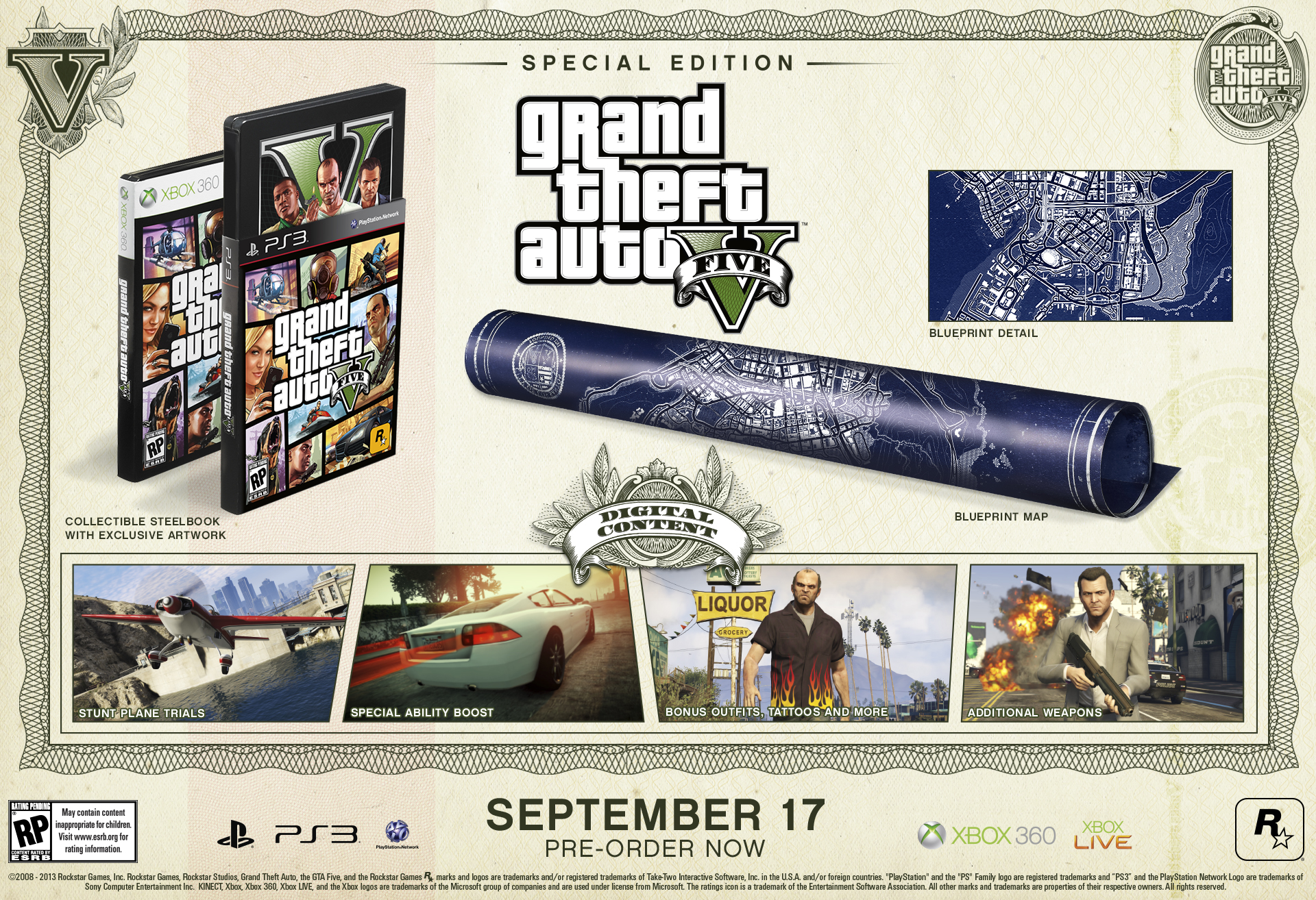 Grand Theft Auto V saldrá a la venta para PlayStation 3 y Xbox 360 el 17 de septiembre.