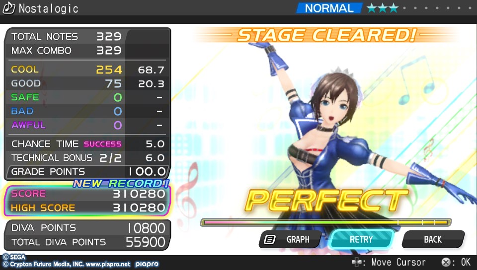 Además todos los temas están muy bien diseñados en cuanto a seguir el tempo y bastante pegajosos, salvo un par donde la música suena muy acelerada y la voz está en tonos que sólo los robots pueden comprender. En general el control y la mecánica de Hatsune Miku: Project Diva F no sólo son buenas, sino que te hacen sentir que la curva de aprendizaje es mínima con un reto que va aumentando paulatinamente.