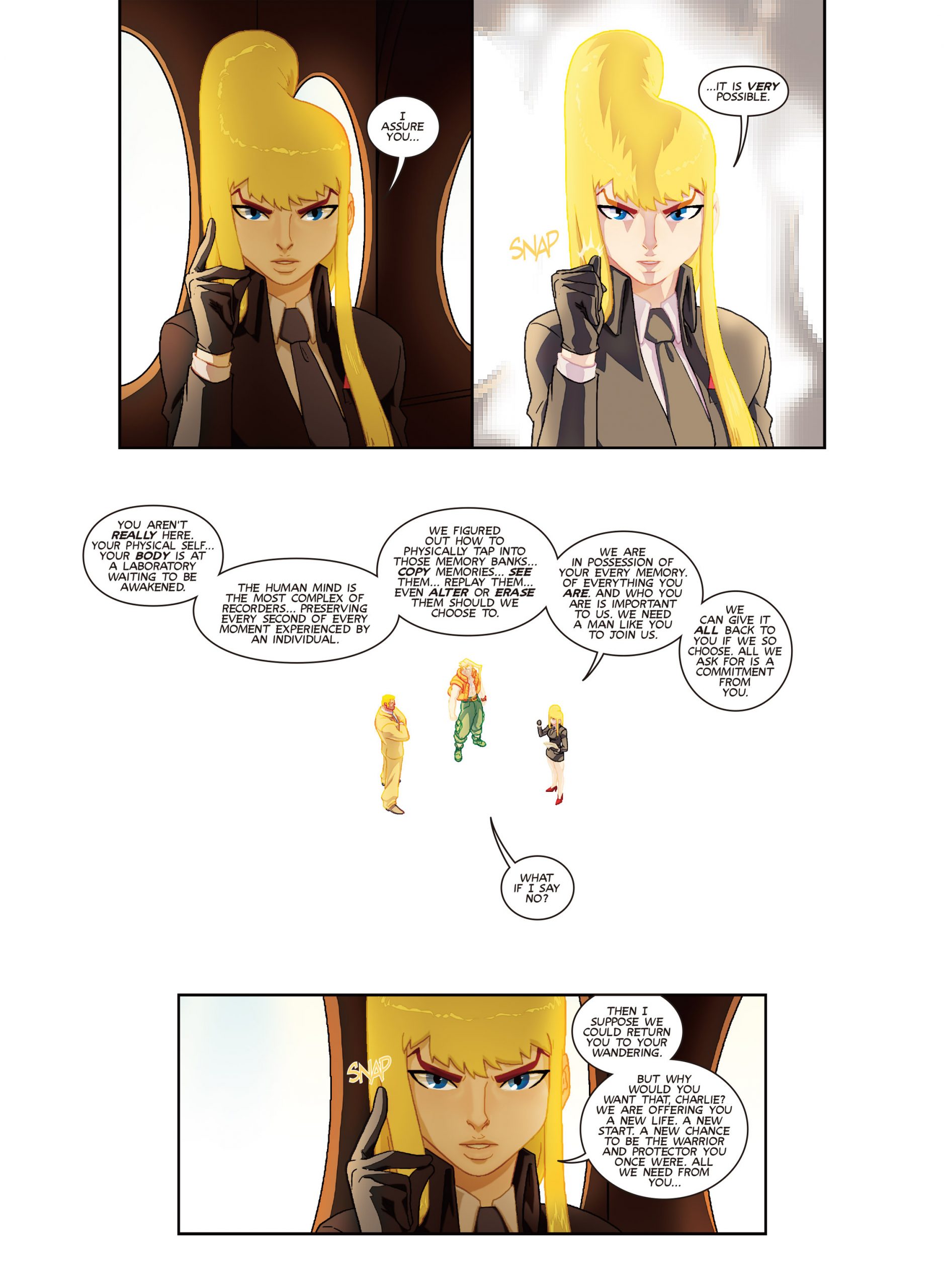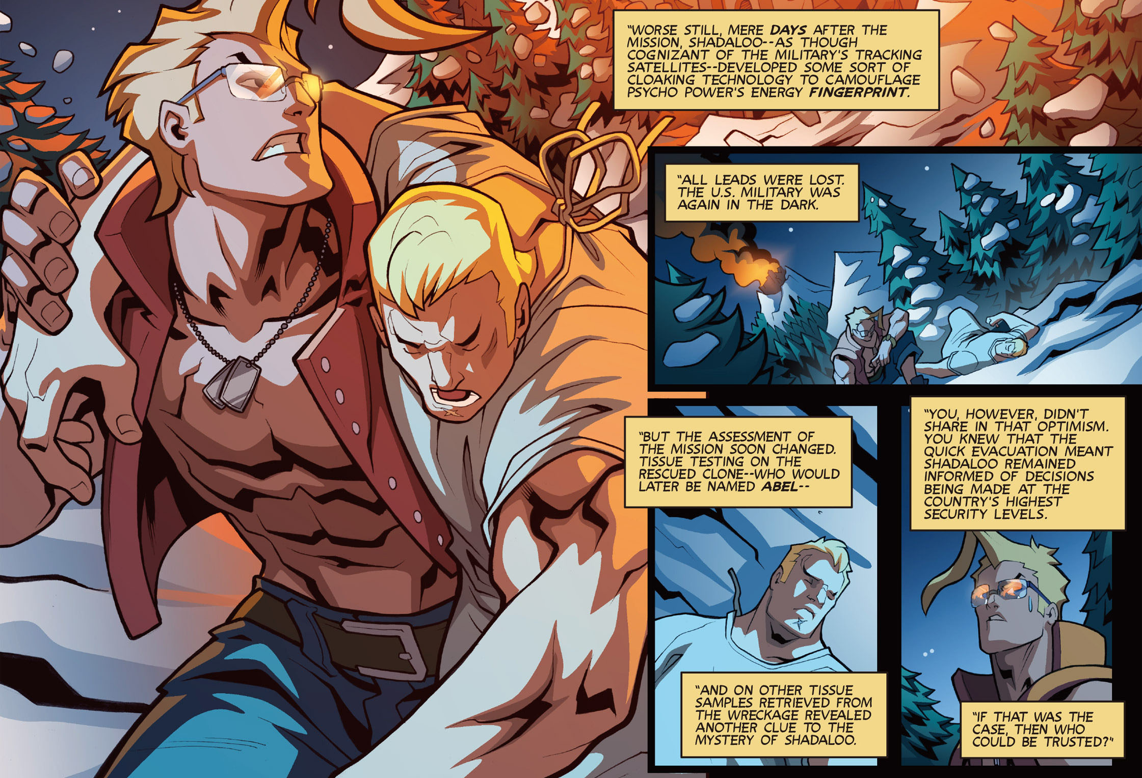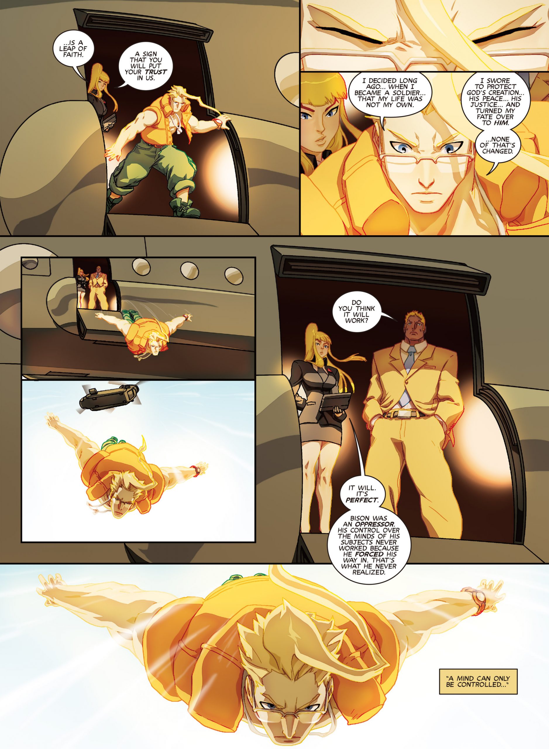 Pero no fue así, al menos no del todo. El cuerpo de ex compañero de Guile está físicamente muerto, pero por alguna extraña razón el Psycho Drive mantuvo intacto su cerebro. Las personas que aparentemente lo encontraron en un desierto al principio del cómic en realidad no están ahí, sino forman una especie de memoria digital introducida en su cerebro para charlar con él, convencerlo de unirse a su causa y “revivir” su cuerpo.
