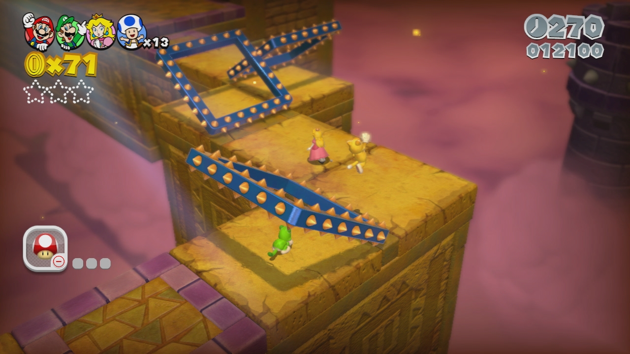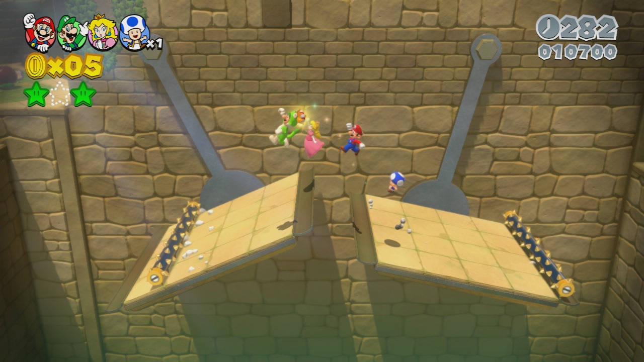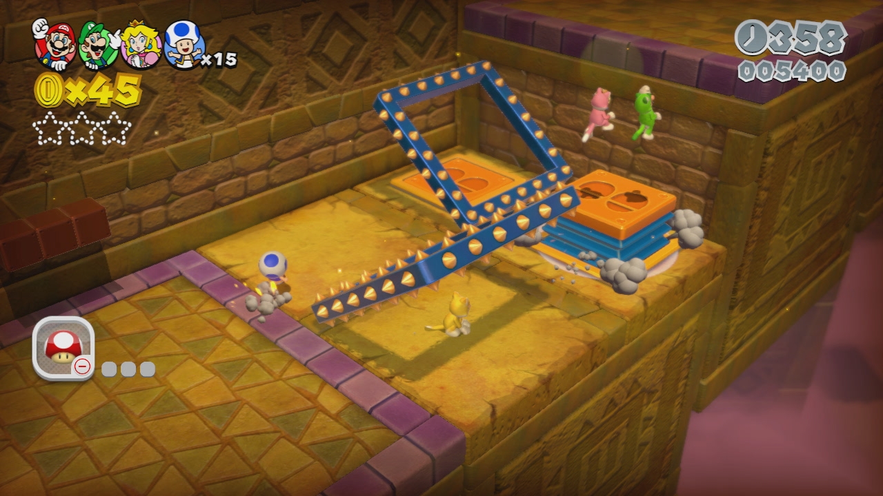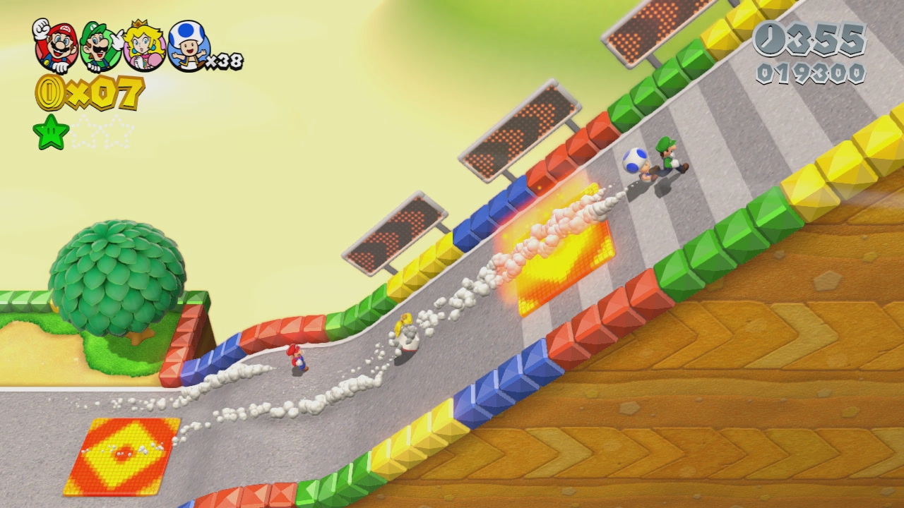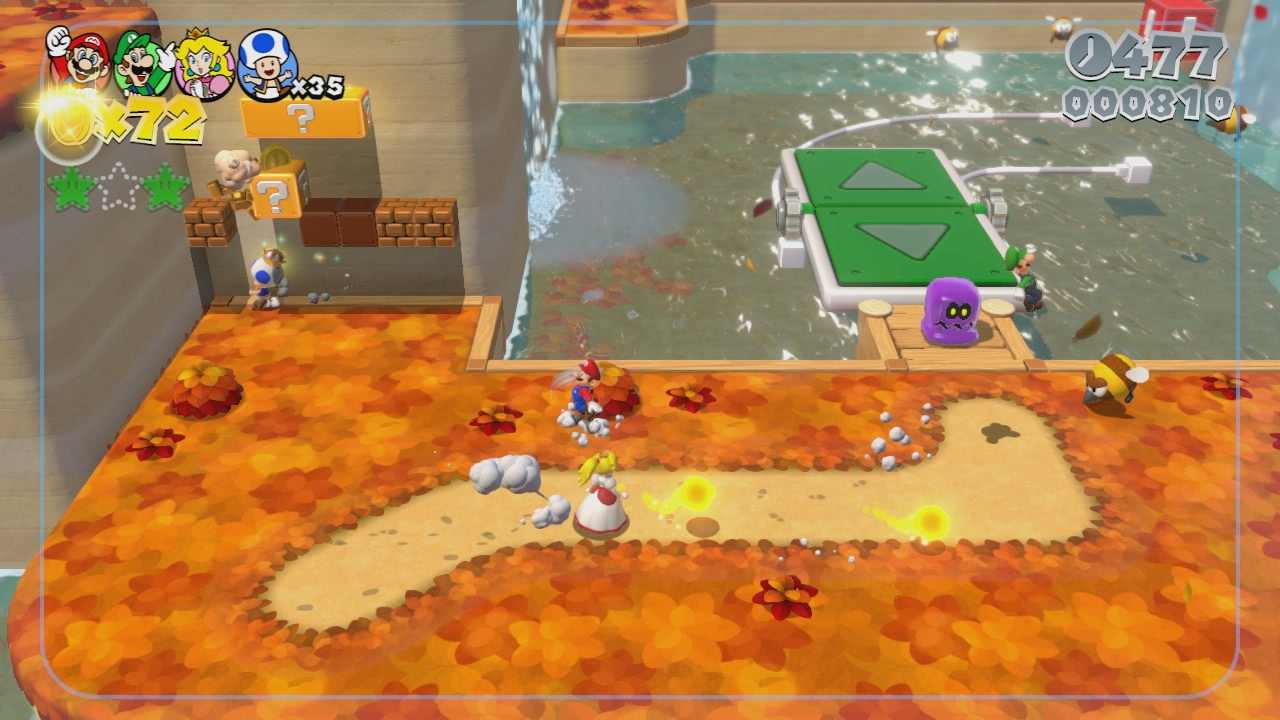En Super Mario 3D World podrás usar a cuatro personajes distintos – Mario, Luigi, Peach y Toad-, cada uno con sus características especiales, como Peach, que puede flotar un poco en el aire, y Toad, que es más rápido. Esta iniciativa también se lleva para un modo cooperativo de cuatro jugadores que además incluye algunos minijuegos como patinaje.