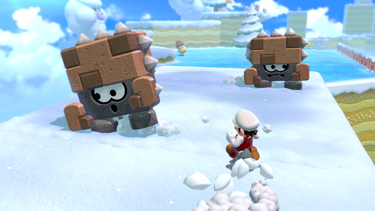 Además de Mario y compañía, las pantallas presentan a nuevos y viejos enemigos, algunas boss battles y también algo de arte del juego, donde podemos ver los trajes como el de Hammer Bros., el de ranita, mapache y el más nuevo, el de gato.