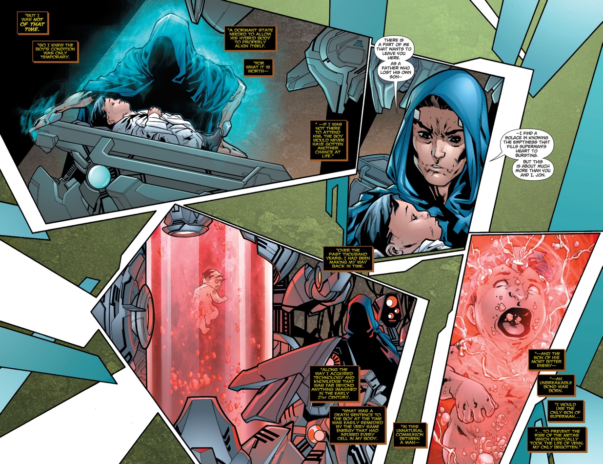 Harvest es originario del futuro, en el cual raptó al hijo de los Kent y lo entrenó, pero encontró que Jon tenía un ADN inestable que le ocasionaba graves problemas de salud. Por esta razón, Harvest viajó al pasado para tratar de buscar una cura en Superboy. Todo esto te parece confuso, así que es un cómic que valdrá la pena leer para entender esta complicada historia. No sólo eso, sino que Jon aparentemente sigue vivo en este nuevo universo.
