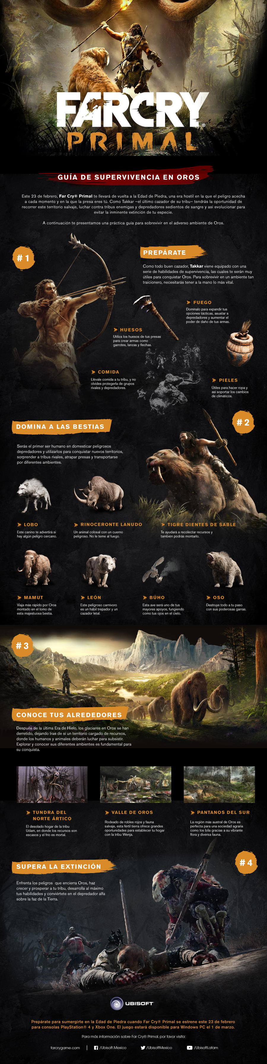 En Far Cry Primal tomamos el rol de Takkar, un cazador de la tribu de Wenja que tiene que reclamar para los suyos el dominio de Oros, un valle que provee todos los recursos que su clan pueda necesitar pero que al mismo tiempo está infestado de criaturas peligrosas y el odio de sus vecinos, que también quieren reclamara para ellos, y sólo para ellos, el dominio del territorio. En específico tenemos a la tribu de Udam, quienes comen carne sin importar si es de animal o de sus enemigos, liderada por el sanguinario Ull, y los Izila, que ya manejan el fuego