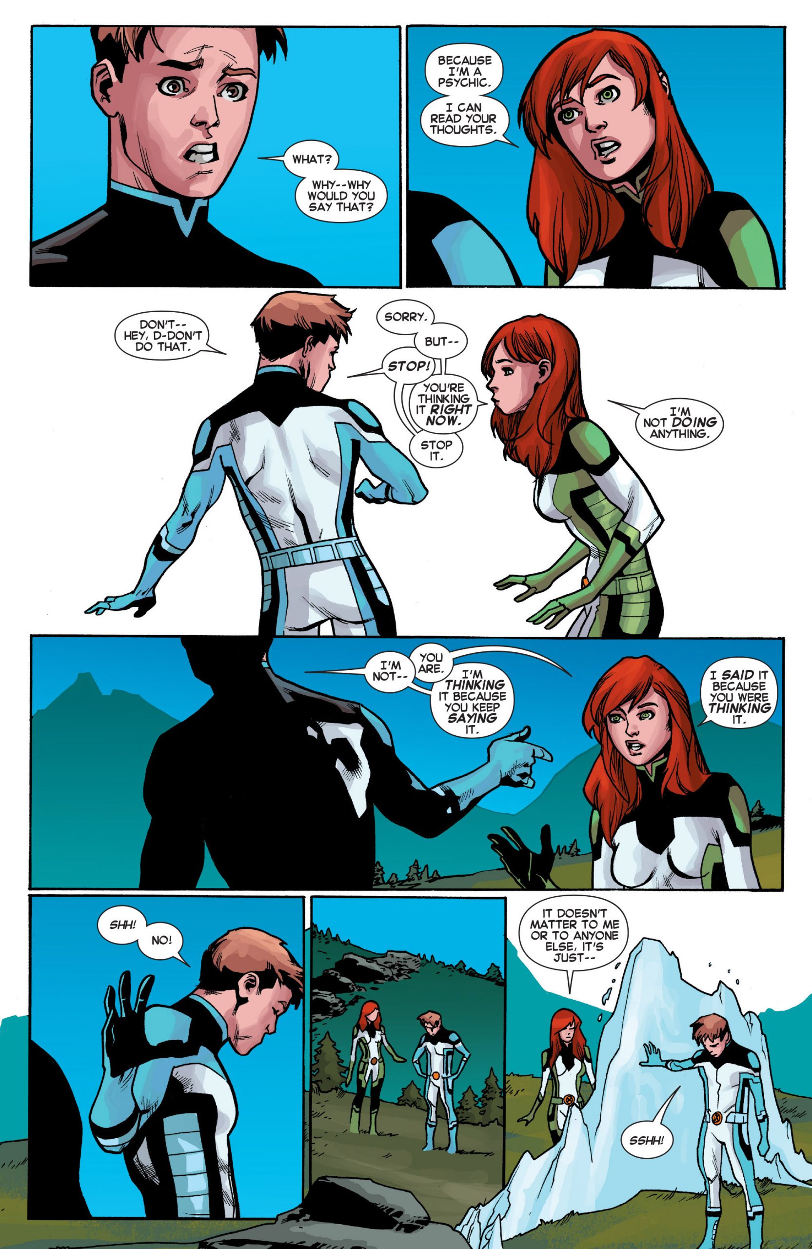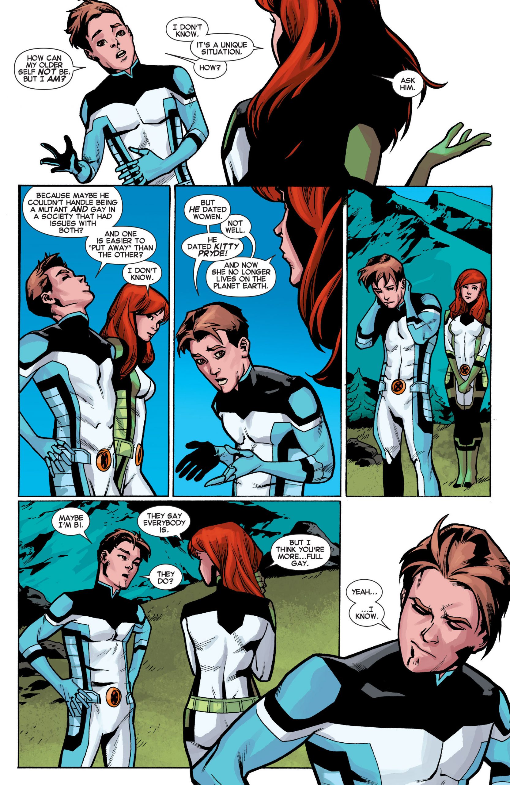 Iceman sin embargo luce más confundido –al igual que Jean Grey- al notar que su futuro yo no es gay, y de hecho ha salido con algunas mujeres, entre ellas Kitty Pride. Aquí tienen la secuencia completa con la revelación.