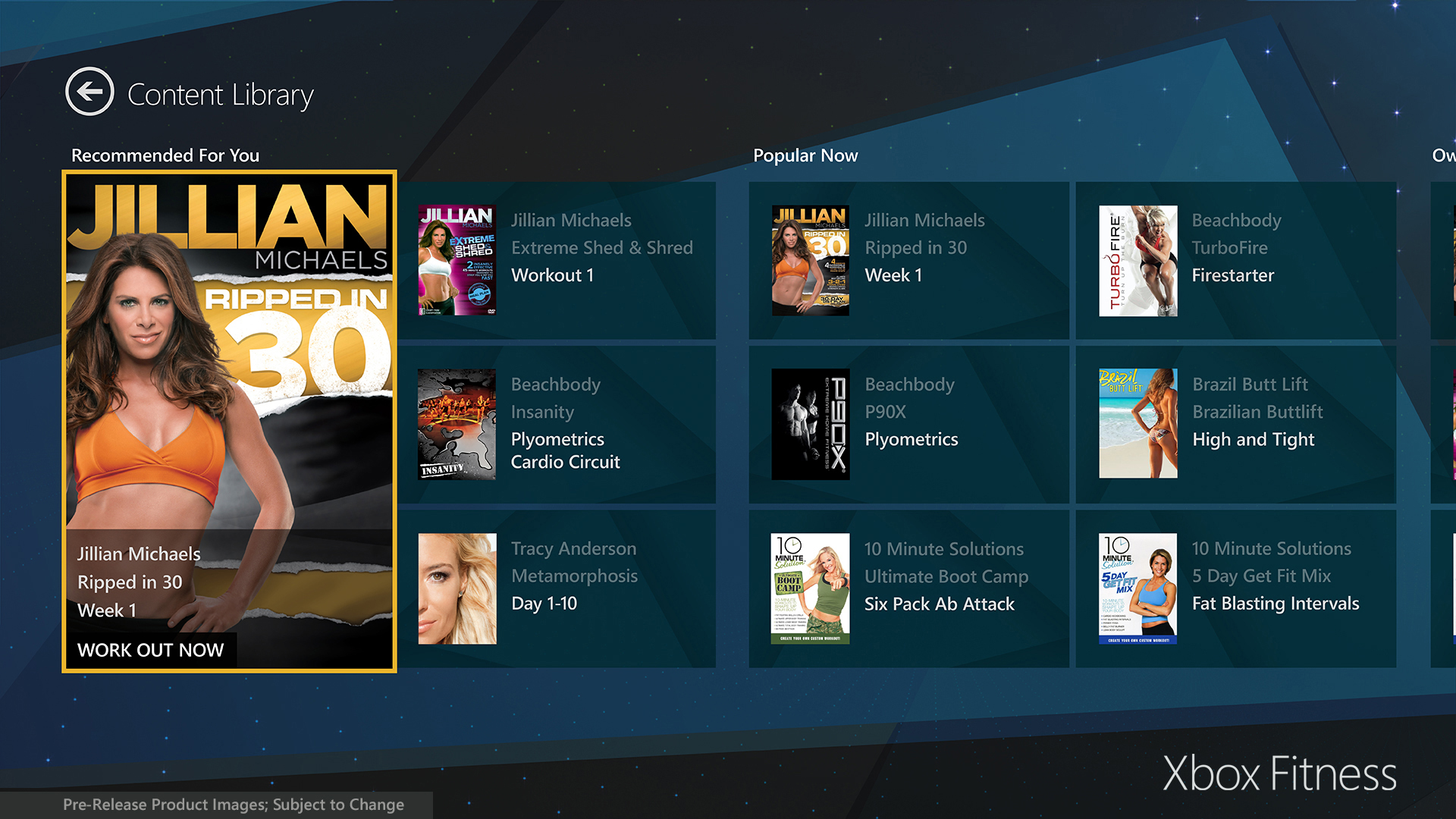 Xbox Fitness se trata de un servicio gratuito disponible a partir de la navidad del próximo años, que incluirá programas de acondicionamiento físico y ejercicios de reconocidos entrenadores como Jillian Michaels y Tracey Anderson, así como de compañías especializadas como Beachbody, famosa por sus circuitos PX-90 e Insanity. La ventaja de estos con Xbox One viene gracias a Kinect, ya que el dispositivo permite medir tus movimientos para mejorar posturas y darte consejos personalizados, mientras la consola guarda un récord de todo lo que hagas.