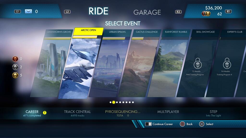 Trials Fusion parece a primera vista, y me refiero enteramente al menú de inicio, un juego un tanto descuidado y sin mucho potencial. Sin embargo son directos y concisos: selecciona Ride de inmediato para ir ahora sí a una pantalla llena de posibilidades en la que incluso es probable que nos perdamos, yo lo hice, pero empezando a apretar botones se aprende. El videojuego nos presenta ocho circuitos y sus respectivas carreras, cada una entrega de una a tres medallas, siendo el máximo número cuando obtenemos el oro. Cabe destacar que el conteo total de preseas ayuda a desbloquear más eventos, sin embargo, los cuales irán subiendo en nivel de dificultad, obstáculos a superar y las motos disponibles.