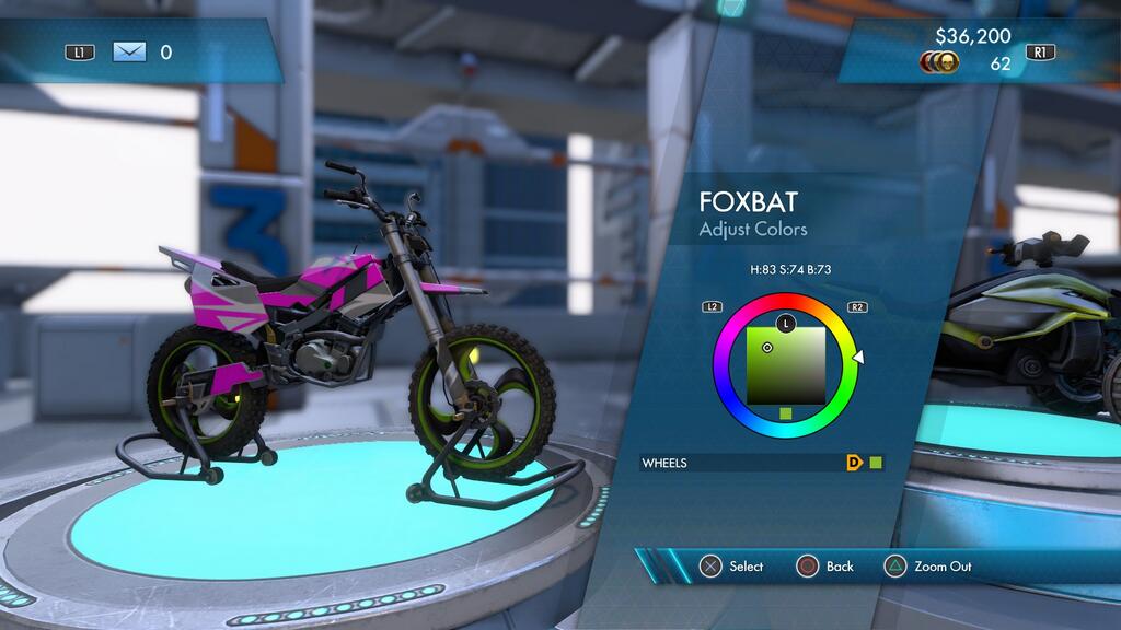 Es preciso hablar del garage, una de las partes tal vez más sencillas pero poderosas para sacarle todo el jugo a Trials Fusion. Consta de dos partes, las motos y el vestuario. Podemos desbloquear seis motos, cada una con características diferentes y solo se usarán en ciertas carreras. Todas son modificables, tanto la carrocería, como los rines y hasta la pintura. Recomiendo colores chillantes, son los que mejor se ven y más lucen al volar.