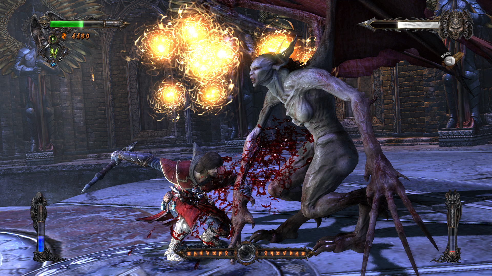 Castlevania: Lords of Shadow también hace uso de reliquias y sirven para cosas tan útiles como darte más fuerza, correr más rápido, doble salto y nuevos combos para lograr jugadas más vistosas y de mayor daño. También cuentas con dos tipos de magia, azul y roja (luz y oscuridad), las cuales sirven como modificador para tus ataques: con la azul recuperas energía al golpear, con la roja haces más daño. Aparte cada una tiene movimientos especiales, algunos de ellos bastante (quizá demasiado) manchados.