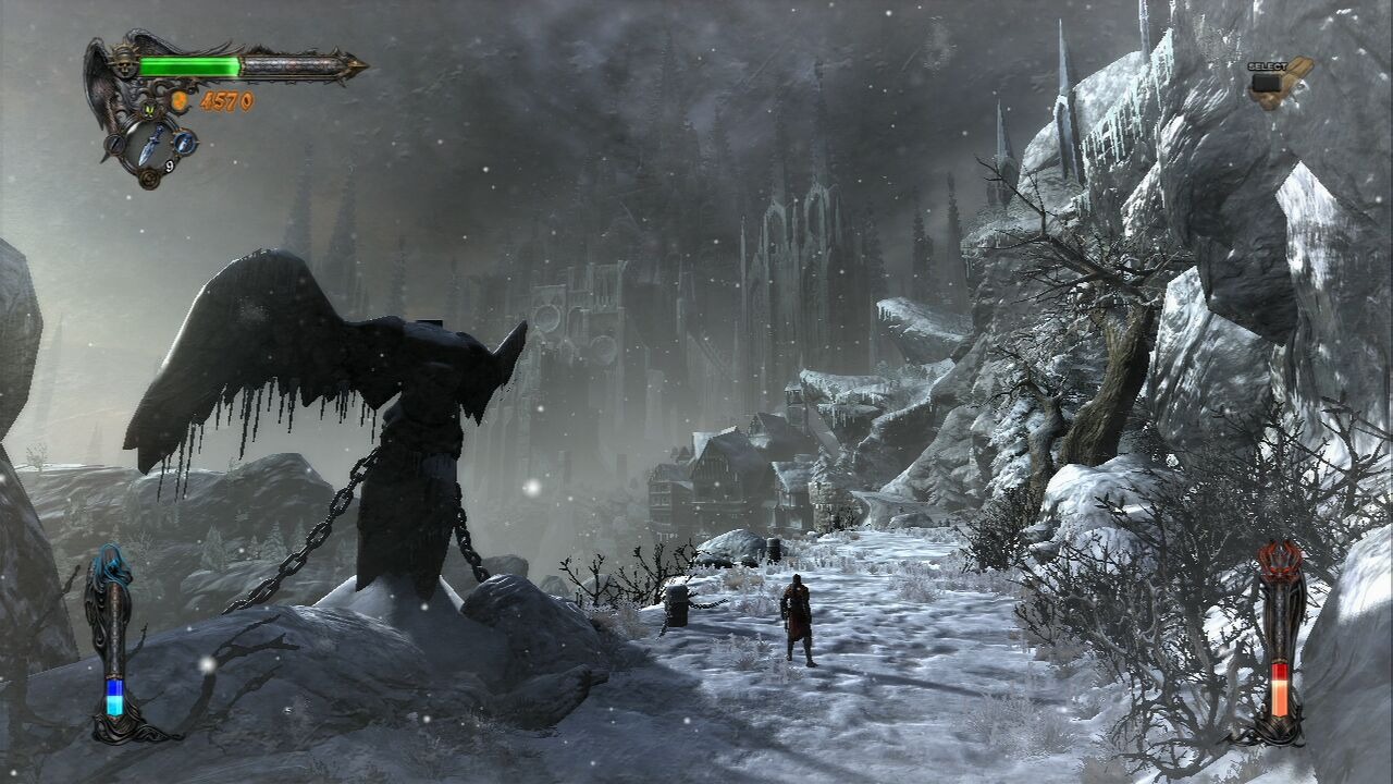 Y vaya que hay variedad de ellos en Castlevania: Lords of Shadow. Me es difícil recordar, no un Castlevania, sino un videojuego cualquiera con tal variedad de paisajes y ambientes. Comienzas en una especie de bosque, después un pantano, para recorrer luego las ruinas de una antigua civilización, de ahí a un paraje cubierto de nieve, un pueblo semi abandonado, templos, castillos, desiertos fumados tipo Dalí, el interior de una caja musical, en fin, variadísimo, todos con mucha riqueza visual y atascados de detalles.