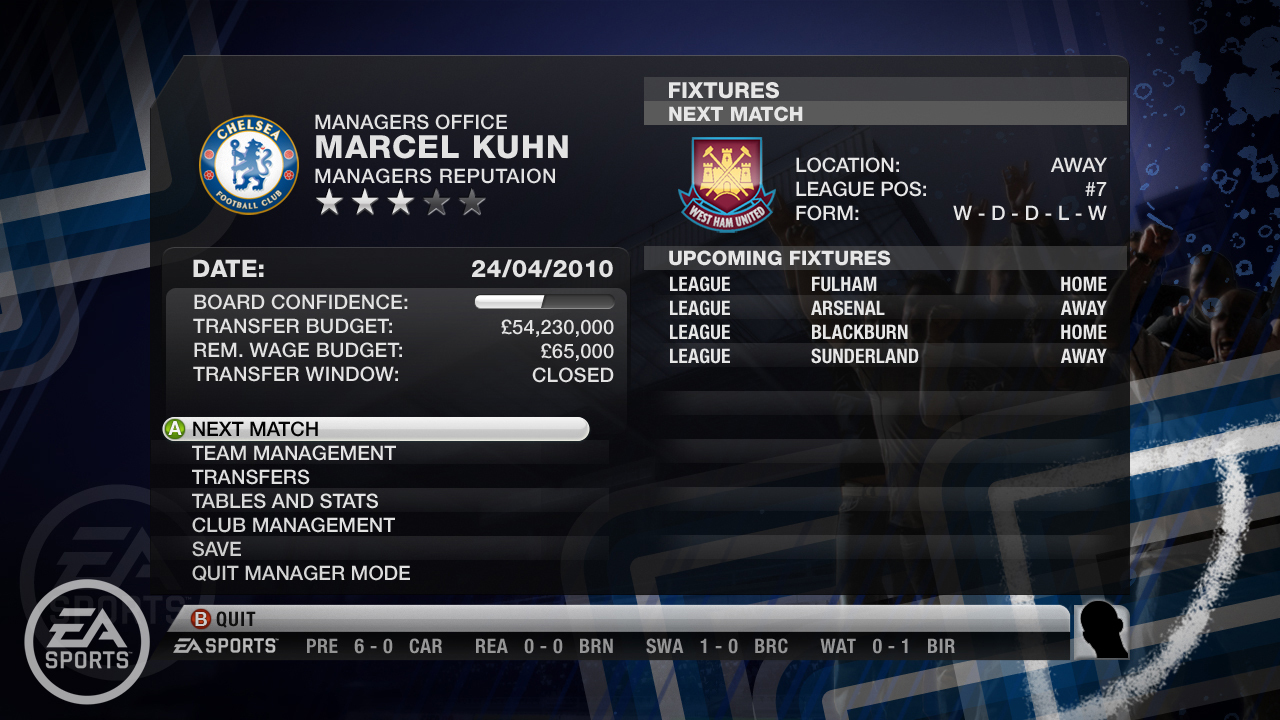 Aparentemente hasta aquí todo es igual que en 2009. Escoges un equipo y ya estás por empezar, te diviertes un poco con el jugador en la cancha mientras esperas que el título cargue y tus expectativas de que la entrega de este año sea mejor a la anterior crecen cada vez más, algo que parece muy difícil ya que FIFA 09 había dejado estándares muy altos.